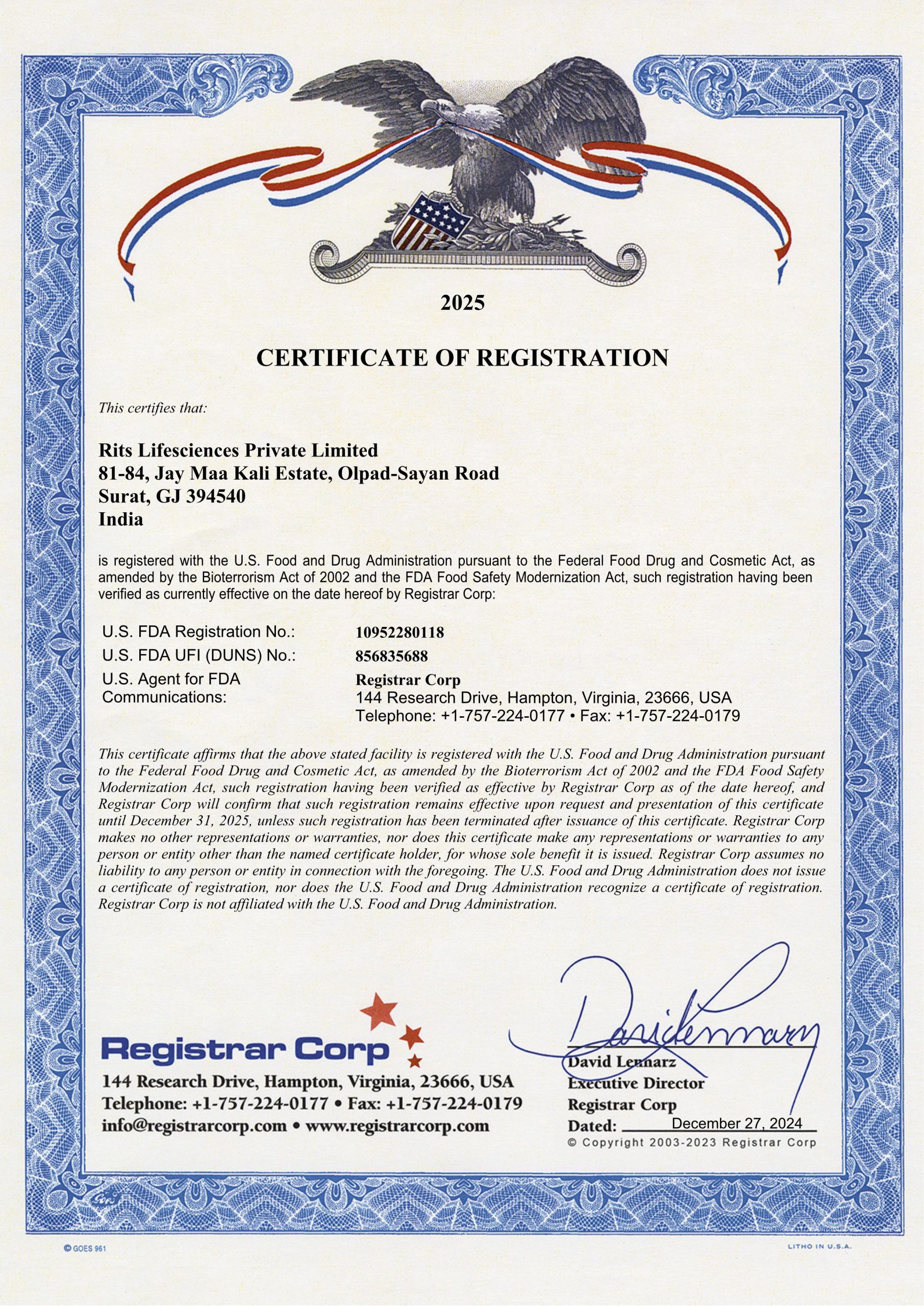 RITS Lifesciences Private Limited holds a current Certificate of Registration with Registrar Corp which registers our facility with the U.S. Food and Drug Administration (FDA). This registration confirms our compliance with the Federal Food, Drug, and Cosmetic Act, enabling us to legally market and distribute our products in the United States. It includes our unique U.S. FDA Registration No.: 10952280118 and is a mandatory credential that demonstrates our commitment to meeting the rigorous health and safety standards required for American consumers.