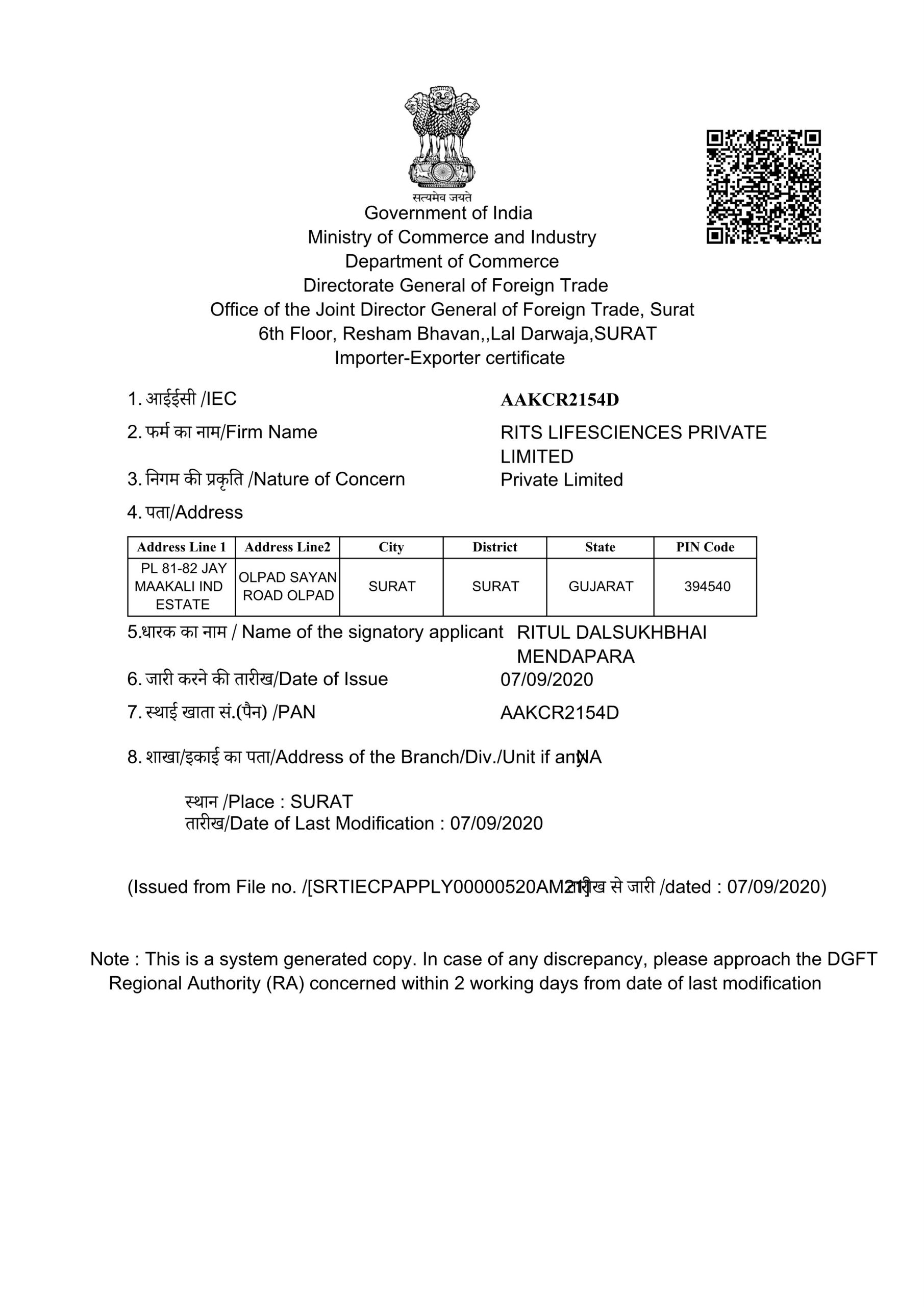RITS Lifesciences Private Limited possesses the essential Importer-Exporter Certificate (IEC No: AAKCR2154D) issued by the Directorate General of Foreign Trade (DGFT), Ministry of Commerce and Industry, Government of India. This pivotal license is mandatory for engaging in the import and export of goods in India, officially establishing us as a registered entity in international trade. The IEC is proof of our legal authorization and capabilities to effectively manage global supply chains and expand our reach into international markets.