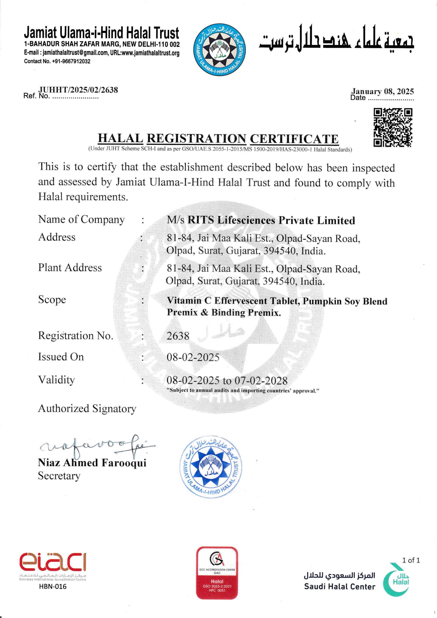 RITS Lifesciences Private Limited has been awarded the official Halal Registration Certificate from the Jamiat Ulama-I-Hind Halal Trust. This certification confirms that our establishment and specific products (including Vitamin C Effervescent Tablet, Pumpkin Soy Blend Premix, and Binding Premix) adhere to rigorous Halal requirements and standards. It ensures our products meet the dietary and processing requirements of our global Muslim customer base, underscoring our dedication to integrity and global market reach.