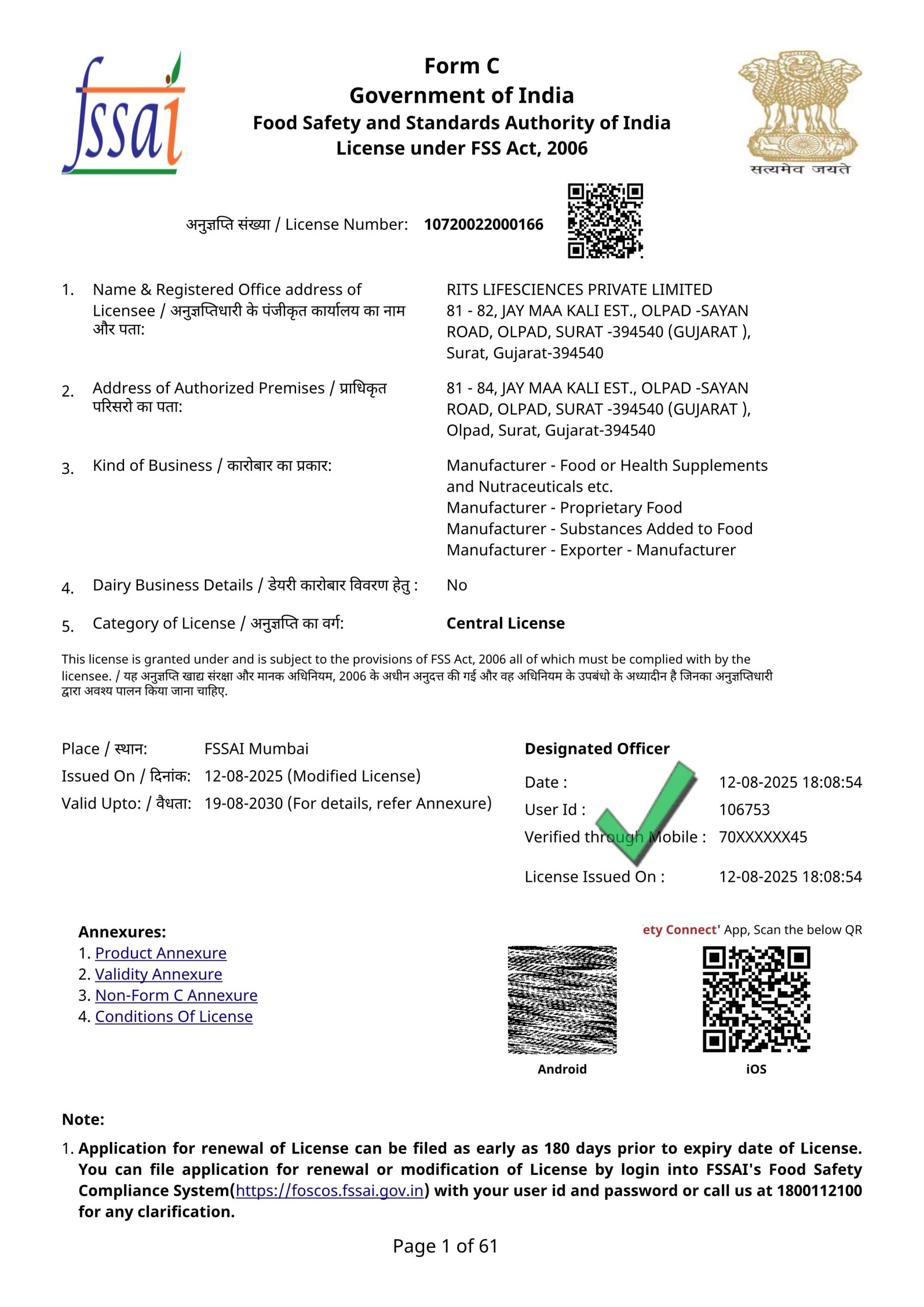 RITS Lifesciences Private Limited holds the vital Central License (License No: 10722002200166) issued by the Food Safety and Standards Authority of India (FSSAI). This mandatory license, governed by the Government of India, confirms our full legal authorization and compliance to operate as a Manufacturer, Exporter, and Importer of Food, Proprietary Food, and Nutraceuticals across India. This central license is the highest level of regulatory approval, signifying our dedication to maintaining the strict food safety and quality standards set by the FSSAI.