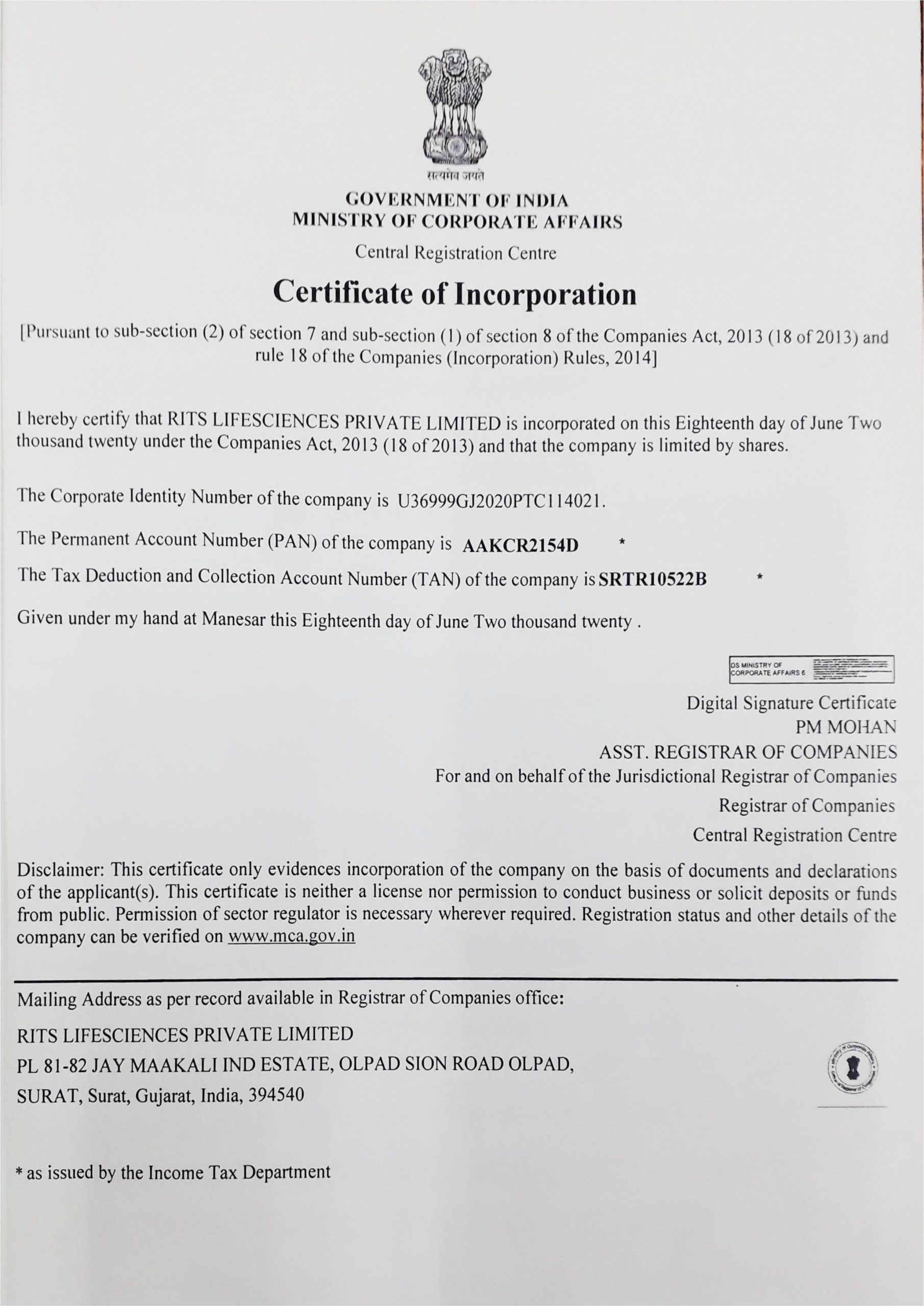 RITS Lifesciences Private Limited holds the official Certificate of Incorporation from the Government of India, Ministry of Corporate Affairs. This foundational document formally establishes the company as a valid and legally registered private limited entity under the Companies Act, 2013. It serves as proof of our legal status, corporate identity (CIN), and compliance with all foundational statutory requirements for operating in India.