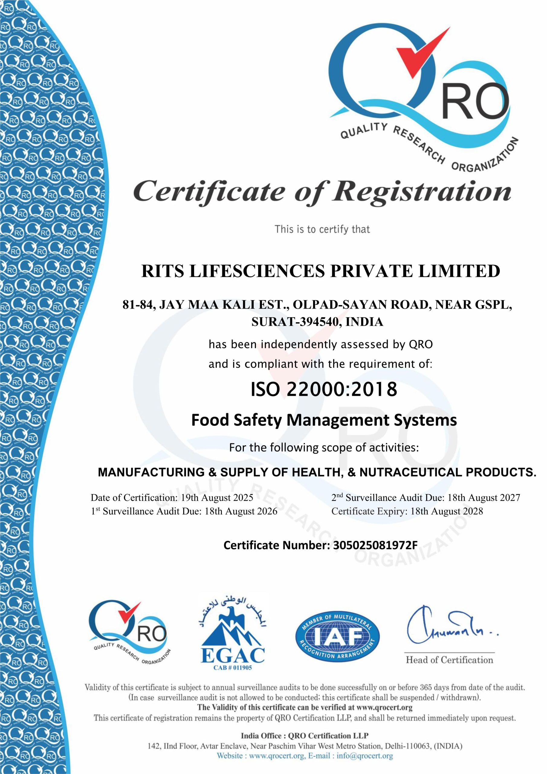 RITS Lifesciences Private Limited is proud to hold the ISO 22000:2018 Certification for Food Safety Management Systems. This prestigious certification, awarded by QRO (Quality Research Organization), validates our stringent standards in the MANUFACTURING & SUPPLY OF HEALTH, & NUTRACEUTICAL PRODUCTS. It is a testament to our unwavering commitment to quality and safety in every step of our process.